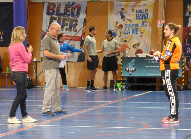 Les deux équipes présentes à la Halle samedi ont eu le plaisir de porter des tee-shirts d’échauffement offerts par la Mutuelle de Poitiers, représentée par Emmanuelle Borges.